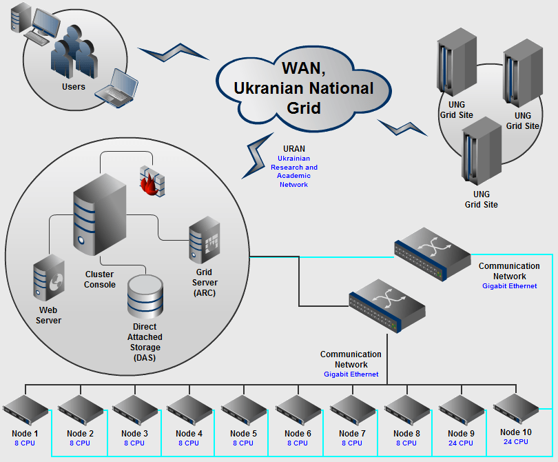 Вычислительный кластер МГИ представляет собой массив из 12-ти вычислительных узлов, соединенных коммуникационной и транспортной сетями, работающих под управлением операционной системы GNU/Linux, из которых: